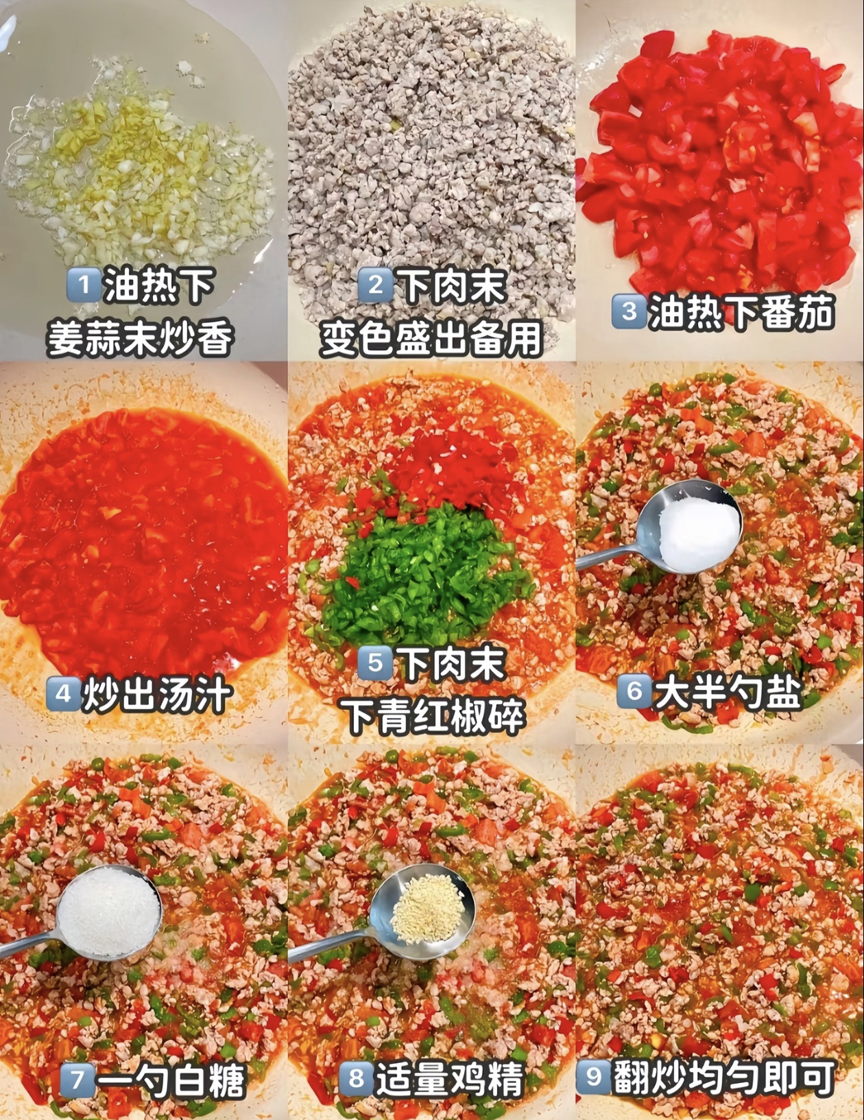 锅里倒油,油热后先下姜蒜末爆香,那股浓郁的香味瞬间就能勾起你的食欲。接着下腌制好的肉末,快速翻炒至变色,然后盛出来备用。这时候锅里还留着底油,把切好的番茄丁倒进去,小火慢慢翻炒,直到番茄炒出沙,变成浓稠的汤汁。这一步是关键,番茄出沙越多,汤汁就越浓郁,拌饭才会更香。