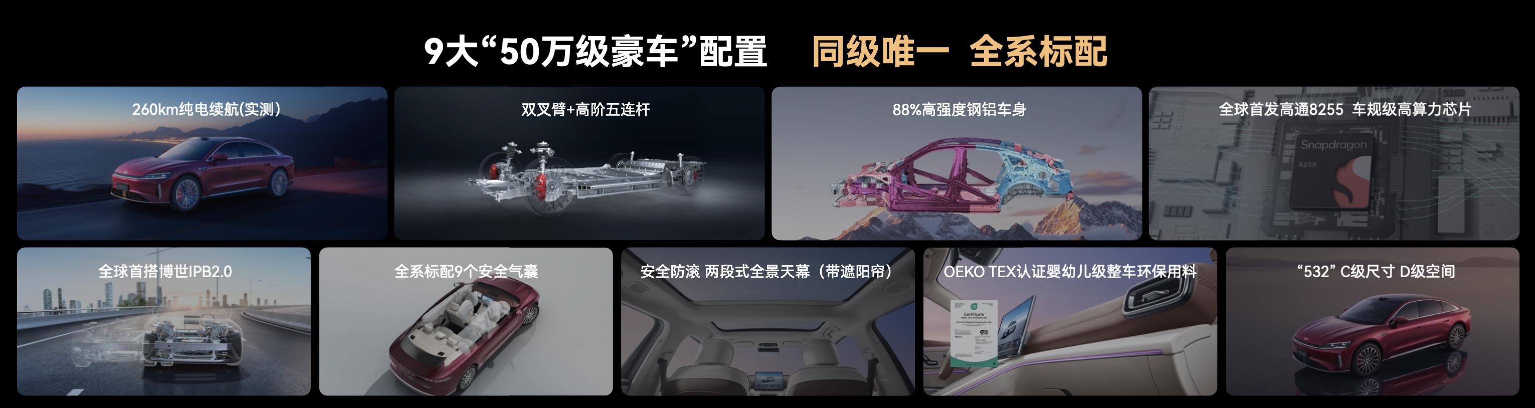 动力上,采用鲲鹏超能电混CDM 6.0系统,搭载1.5T发动机+双电机组成的插电式混合动力系统。综合功率为639马力(470千瓦),综合扭矩为854牛·米。传动方面,匹配电混DHT Pro变速箱。标配磷酸铁锂电池,供应商国轩高科,容量为33.68kWH,CLTC纯电续航里程为200公里。
