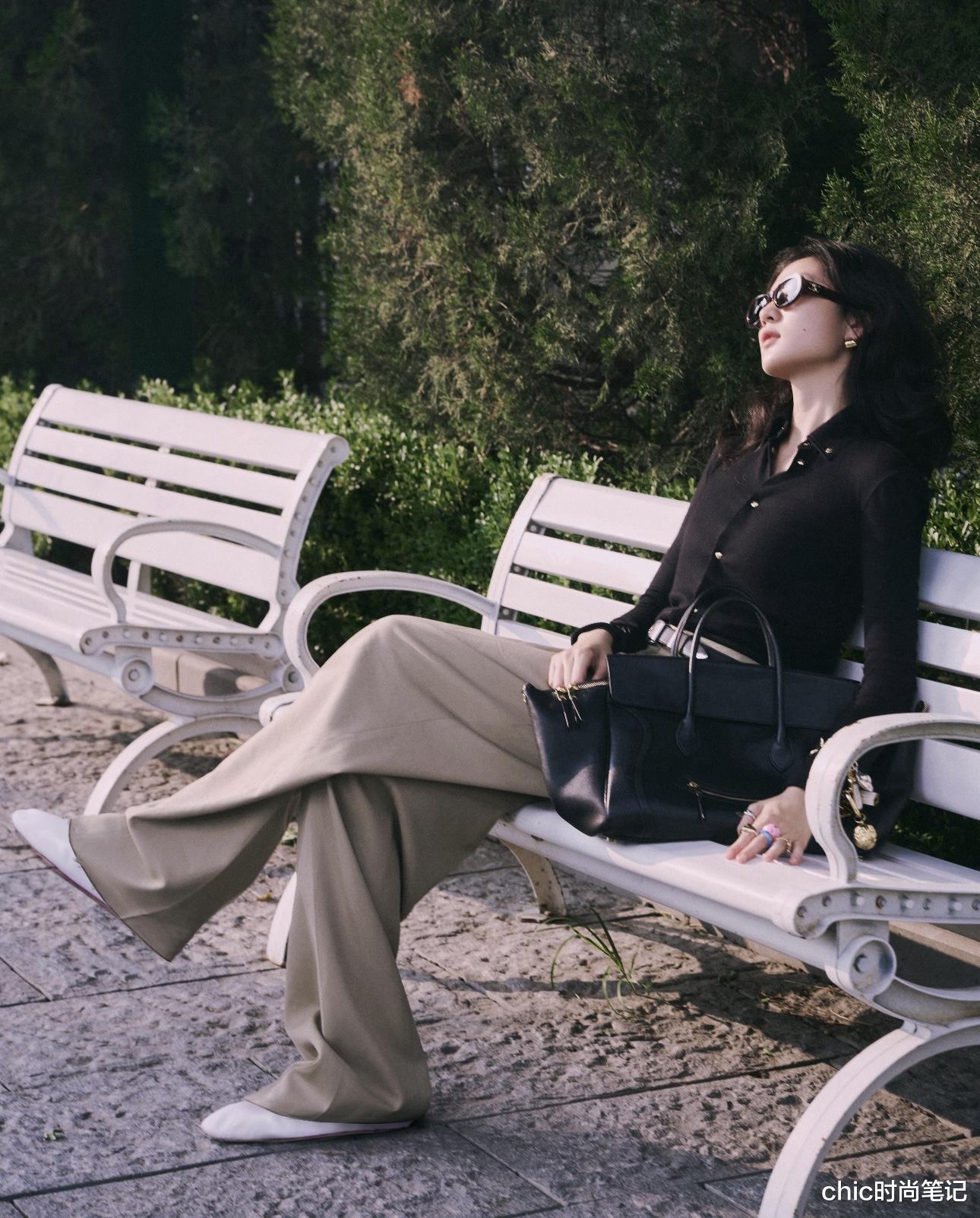 一件百搭款黑色针织衫搭配的是卡其色阔腿西装长裤,修身的针织衫配上宽松的阔腿裤,不仅配色高级,而且自带随性且松弛的氛围感,很经典的淡人穿搭。