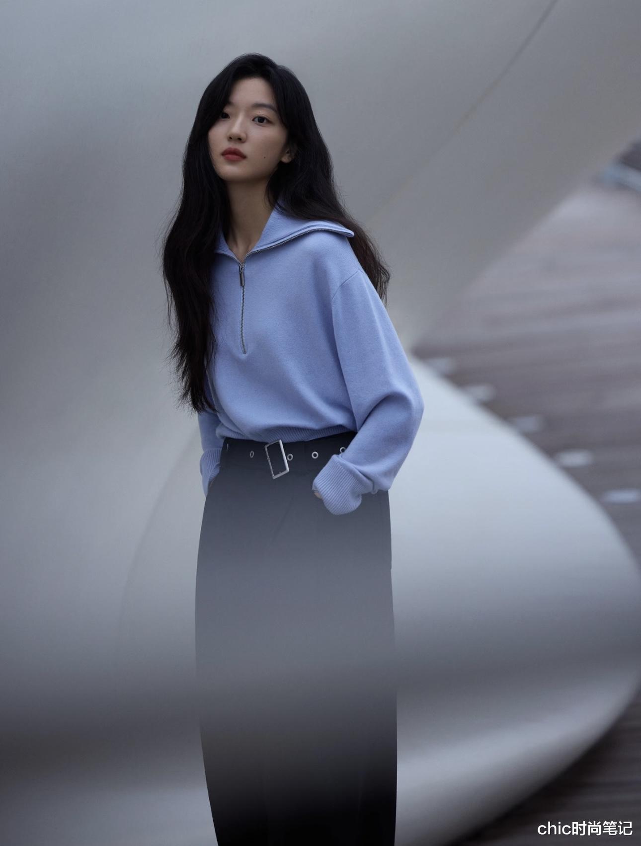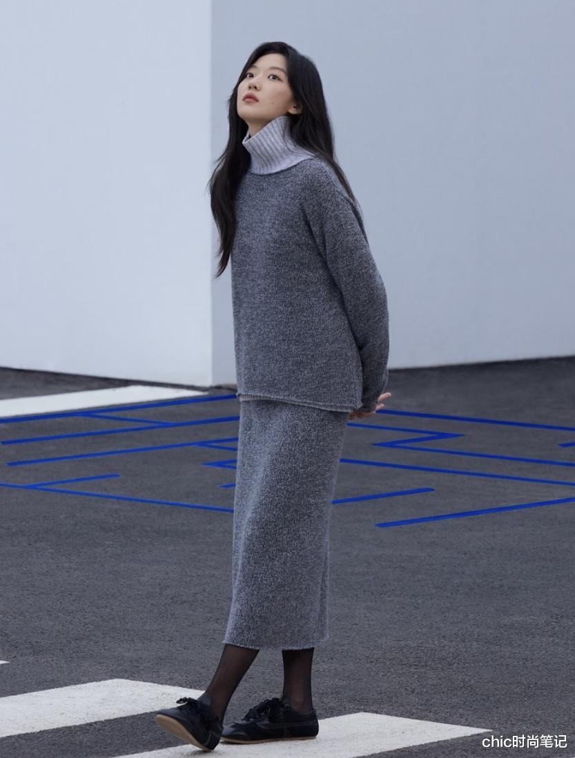 灰色毛衣套装裙简约而不失格调,虽然毛衣半身裙是长款的设计,但对于高个子来讲并不会压身高,反而是有一种自带的清冷感。