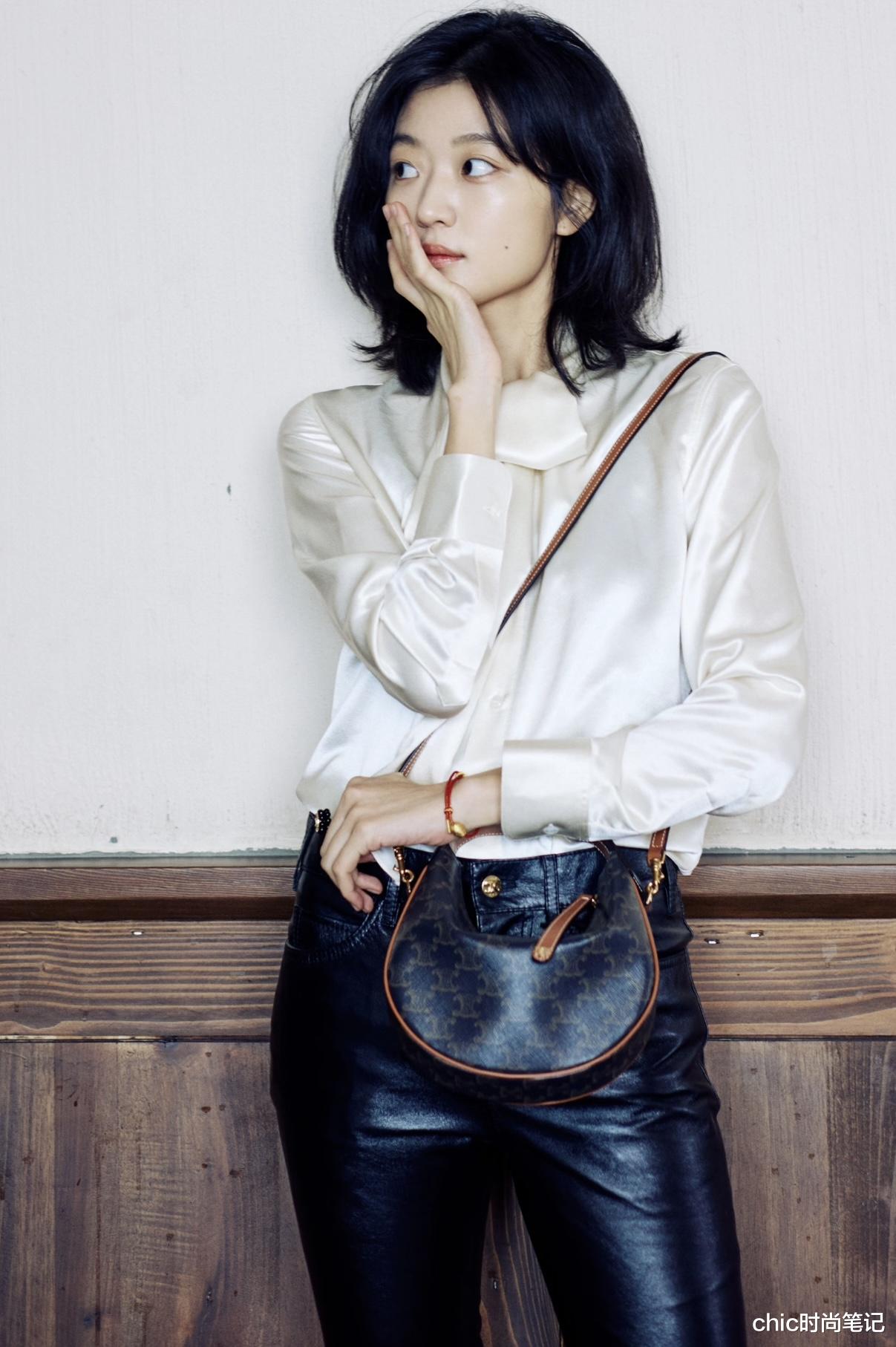 珠光白缎面衬衫自带光泽感和亮感,是非常适合在秋冬季节作为内搭的单品,蝴蝶结丝带系在胸前提升精致度,搭配高腰修身款黑色皮裤,御姐范十足。
