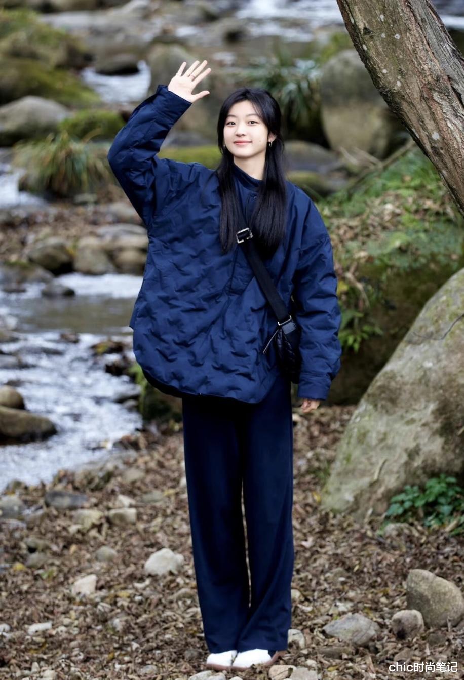 藏蓝色轻羽绒服保暖效果up,搭配深色系休闲长裤和德训鞋,搭配干净的妆容,给人一种清新、淡雅的既视感。