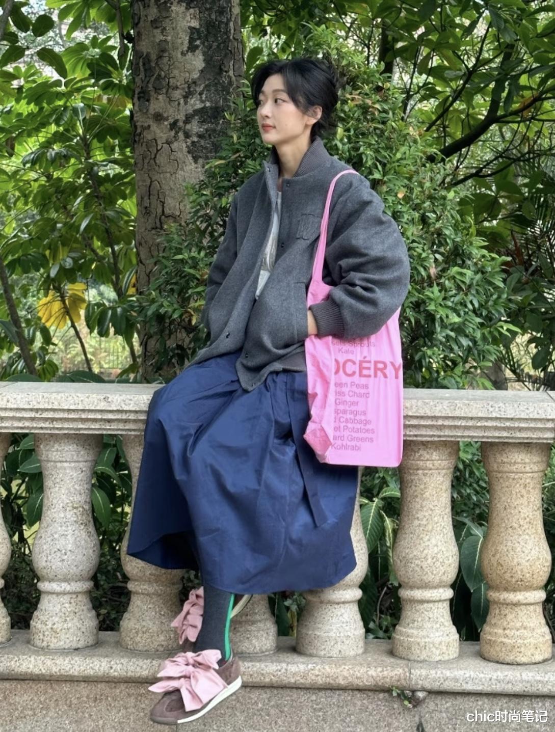 灰色羊绒面料外套搭配藏蓝色工装裙,选择粉色元素来作为搭配点缀,粉色帆布包+粉色蝴蝶结运动鞋的加持,少女的活力感轻松驾驭住了。淡人们喜欢的宽松(活力版)穿搭get到了。