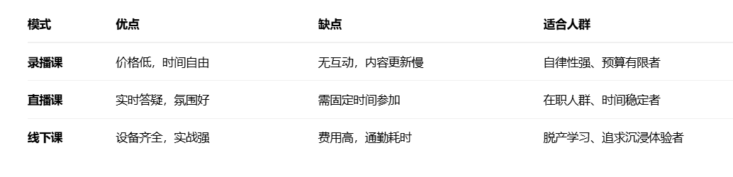 线上课:性价比高(学费比线下低30%-50%),支持碎片化学习,适合在职人群;但需自律。