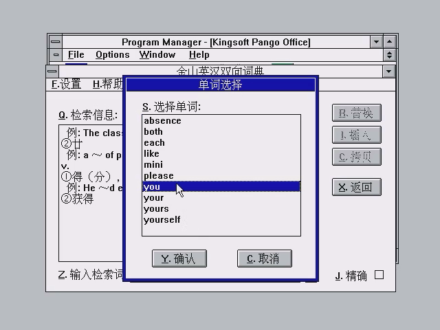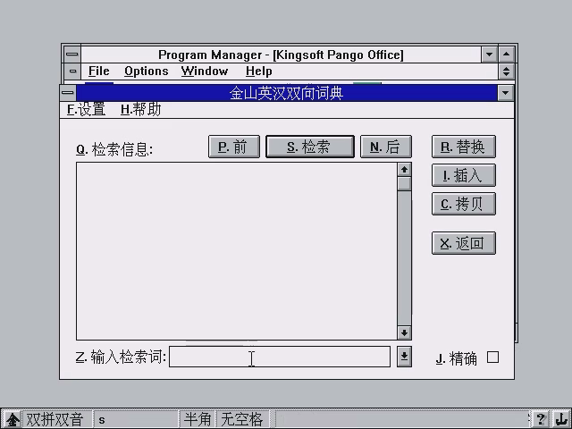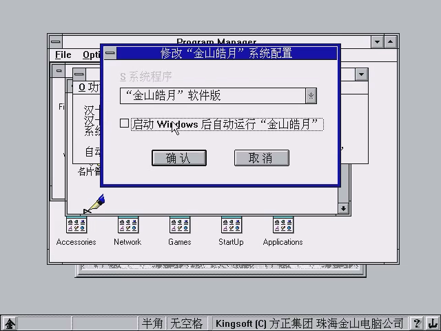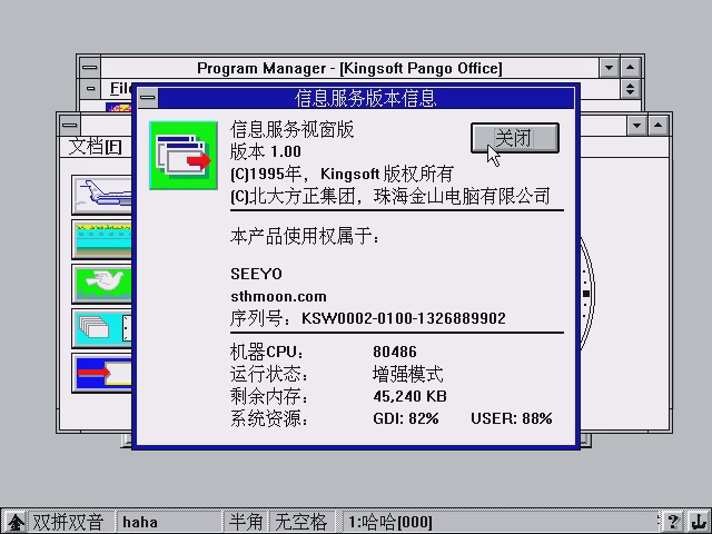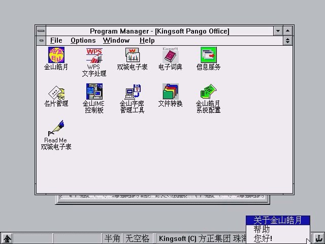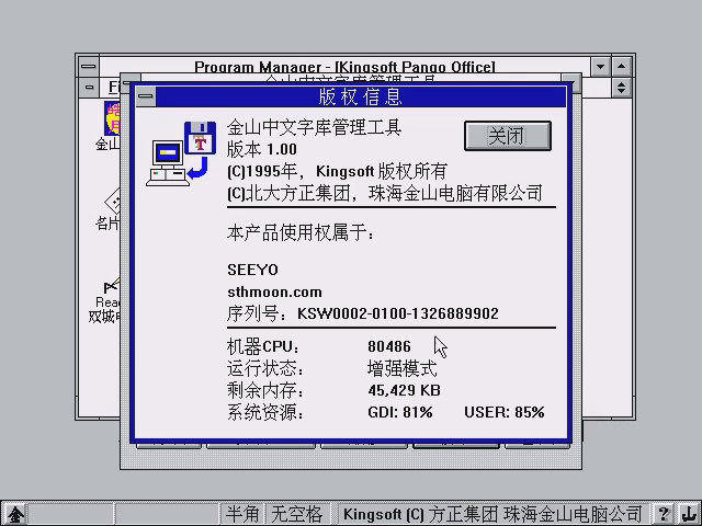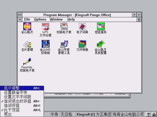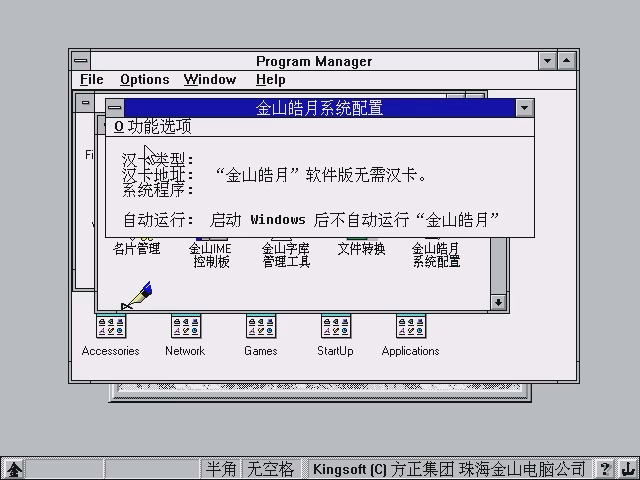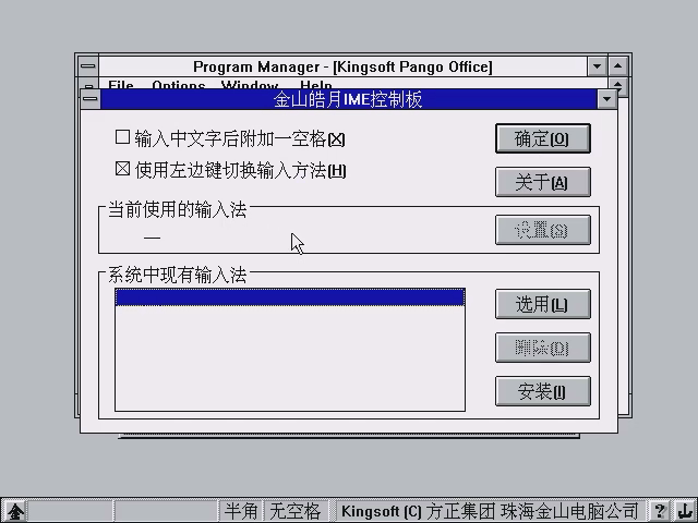 ▲金山皓月IME控制板,我这里是英文版系统所以没有任何中文输入法,如果是Windows 3.2的话应该会有显示出来吧。