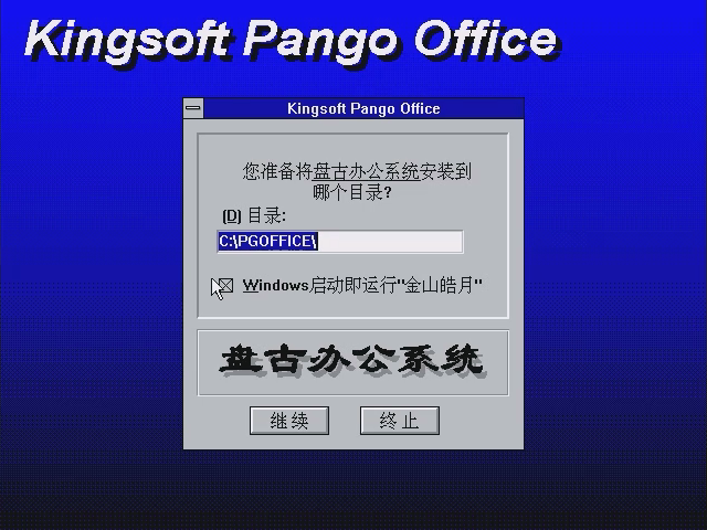 ▲运行pgsetup.exe,顶上的书法盘古就是这样写的,并非什么文字组合的动画还没播放完。