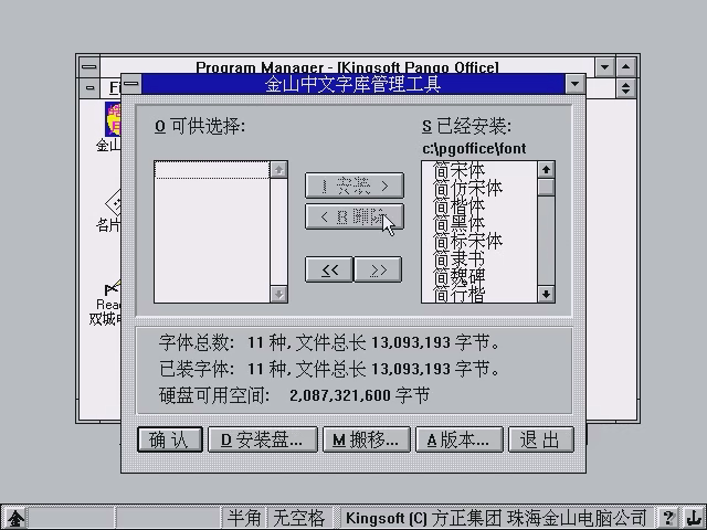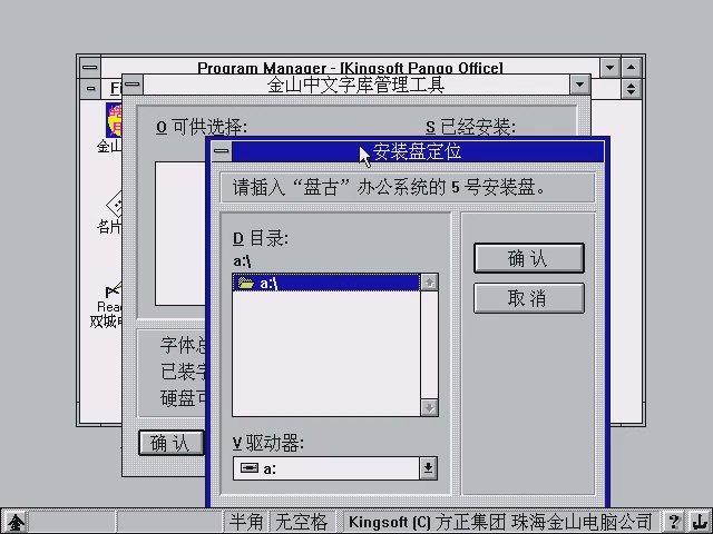 ▲金山中文字库管理工具,打开就提示插入5号安装盘,我手头没实体盘所以也不知道5号盘到底是什么。