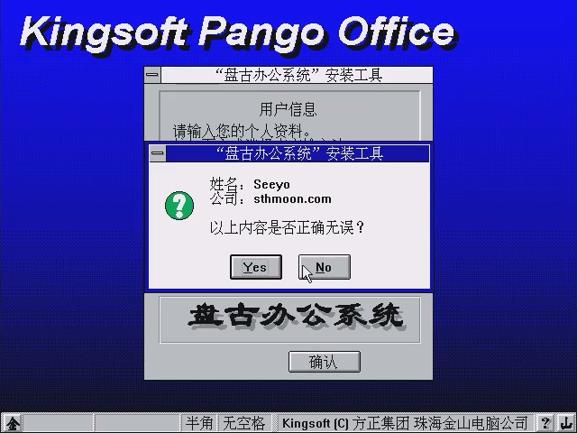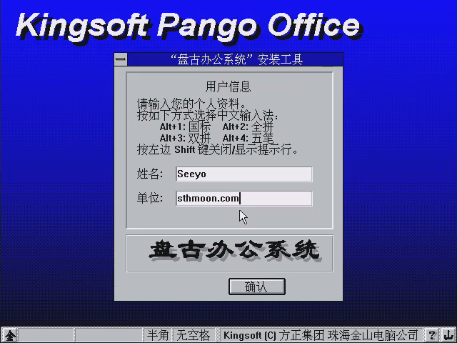 ▲输入用户信息,金山皓月带了四种输入法,用Alt+1/2/3/4切换。它带了我最喜欢的双拼,但是不清楚布局是什么输入法的。