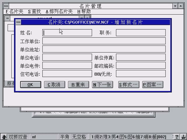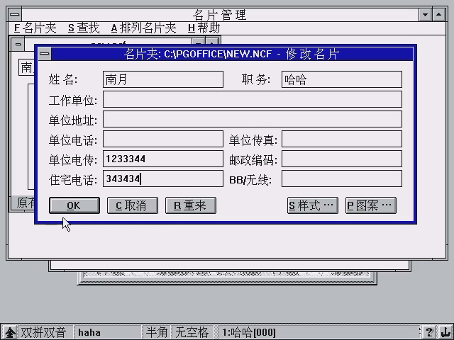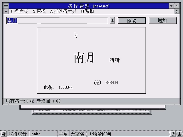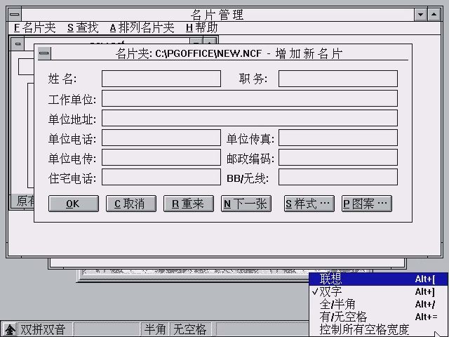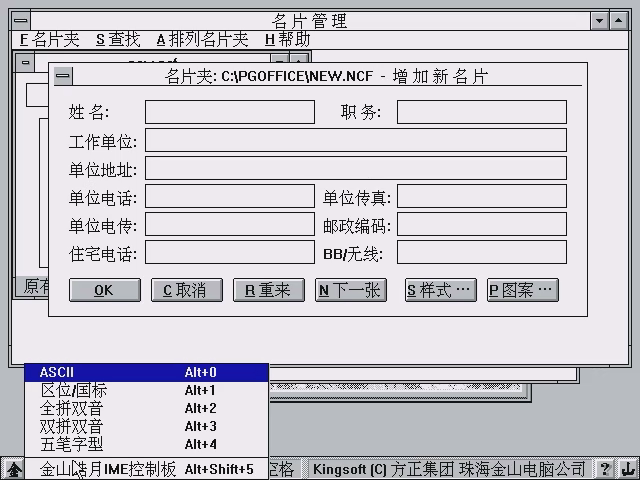 ▲名片可以填写的内容,以及,金山皓月的输入法,第一个是英文输入,后面四个是中文。