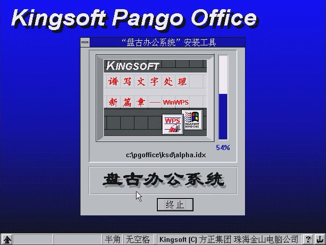 ▲54%这一步会卡很久,这其实是在解密。可以看到底部输入法状态条已经出现,这是金山皓月带的。