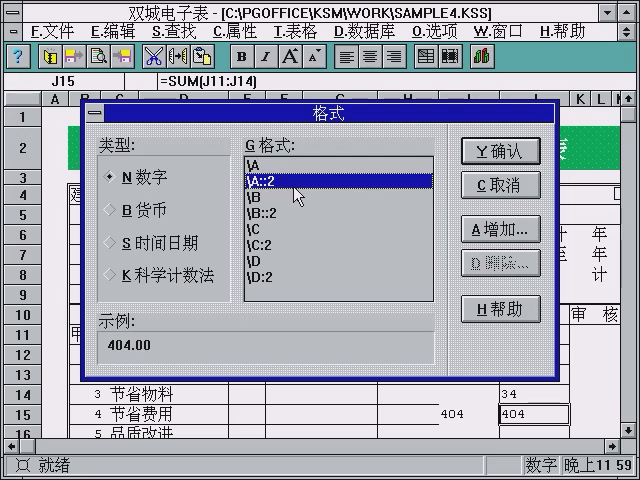 ▲设置单元格格式,支持数字、货币、时间日期和科学计数法四种。