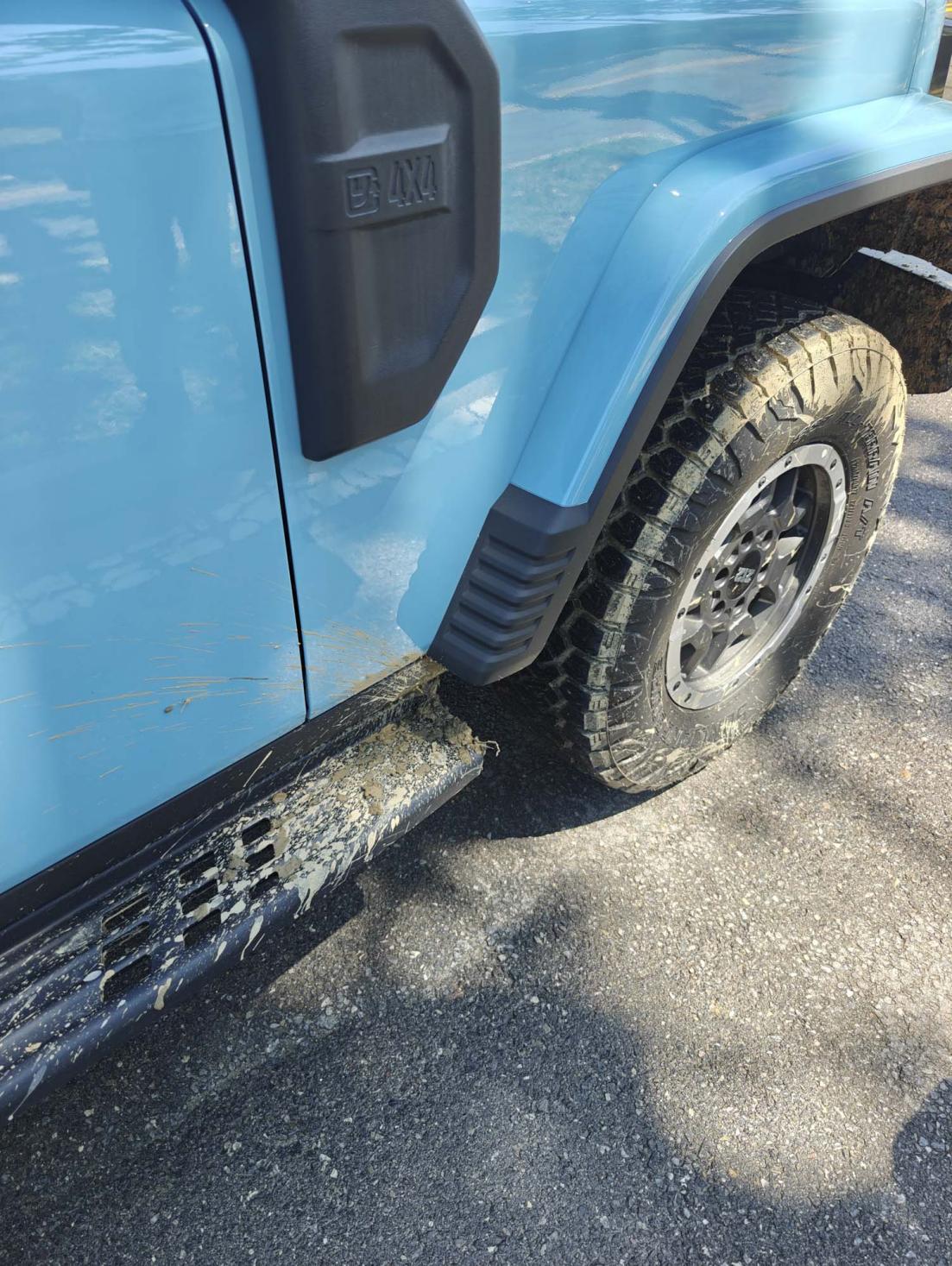 开过泥路有点小脏,问题不大。不过有一说一,有了这个踏板方便不少,除了上下车之外,还能防一些小剐小蹭的,不用担心蹭到车漆,一物两用具象化。