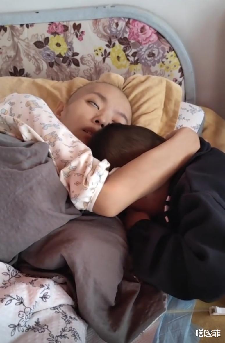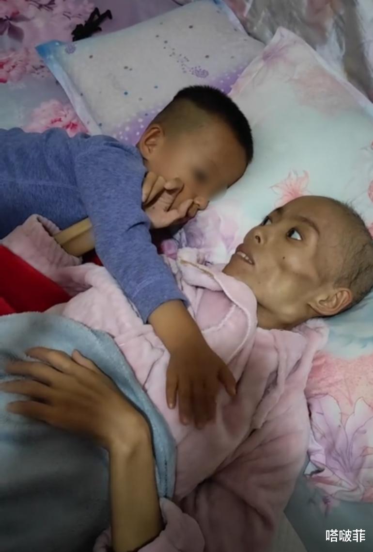 只是短短的一两个月而已,圆圆的脸蛋变成了皮包骨的样子,瘦骨嶙峋这个词在这一刻具象化了,网友们隔着屏幕都能感受到她的痛苦。4岁的孩子似懂非懂,但是他知道母亲生病了,知道母亲想睡觉,还会哄着她!