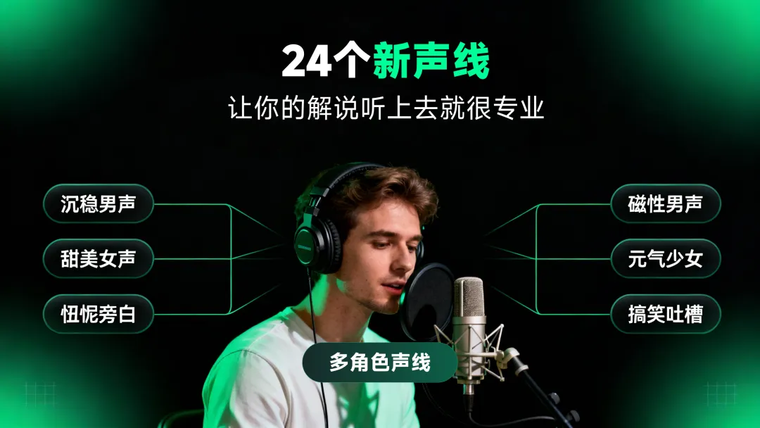 02 | 声音进化:24个新声线,听上去就很专业现在的竞争有多卷?以前用系统自带的机械配音读稿也能火,现在声音没情绪、没起伏,观众划走只需1秒。