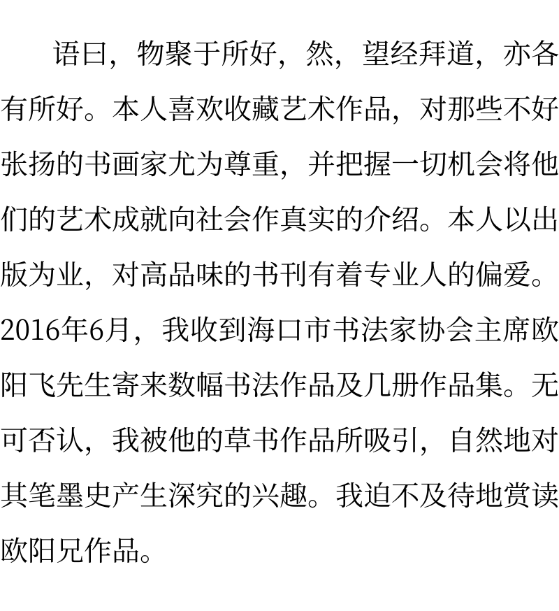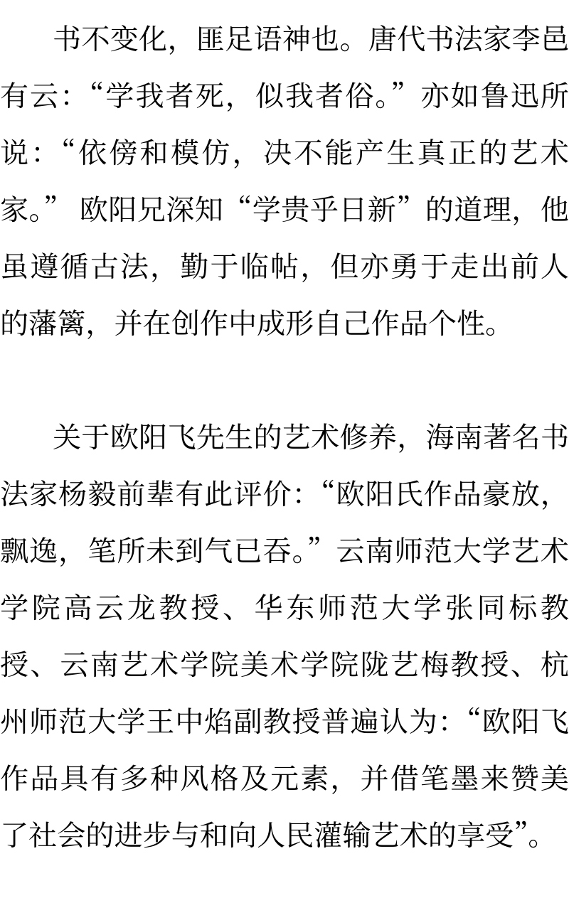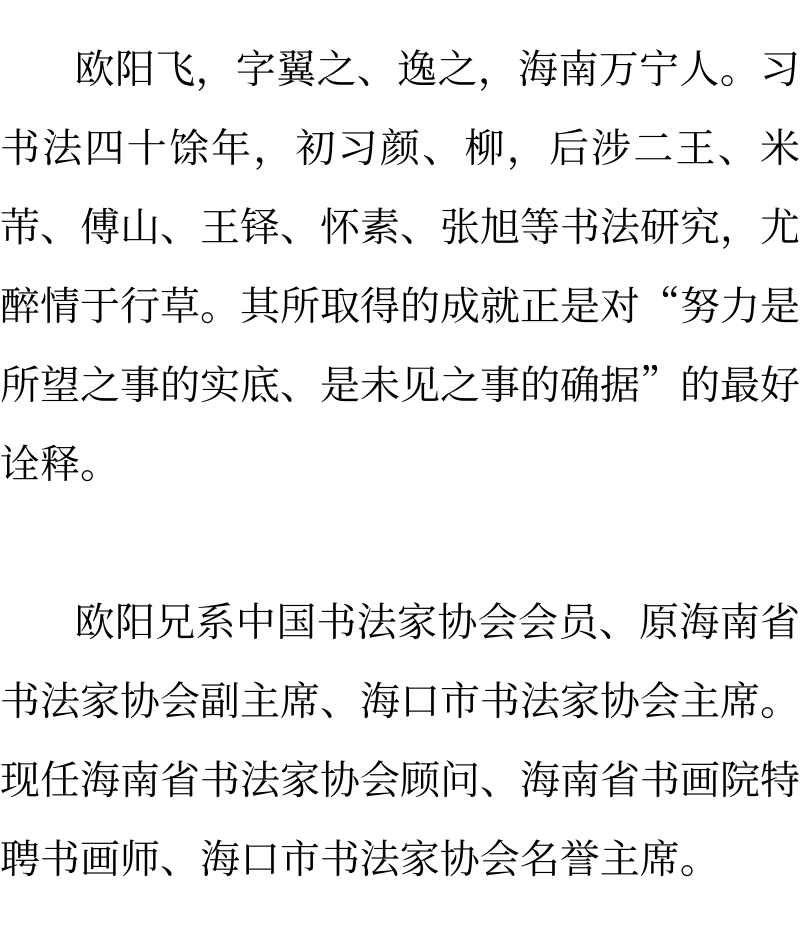 欧阳飞,字翼之、逸之,海南人。中国书法家协会会员,第六届中国书法家协会产业发展委员会委员,原海南省书法家协会副主席、海口市书法家协会主席。现任海南省书法家协会顾问、海南省书画院特聘书画师、海口市书法家协会名誉主席、四川省草书研究会特聘研究员。