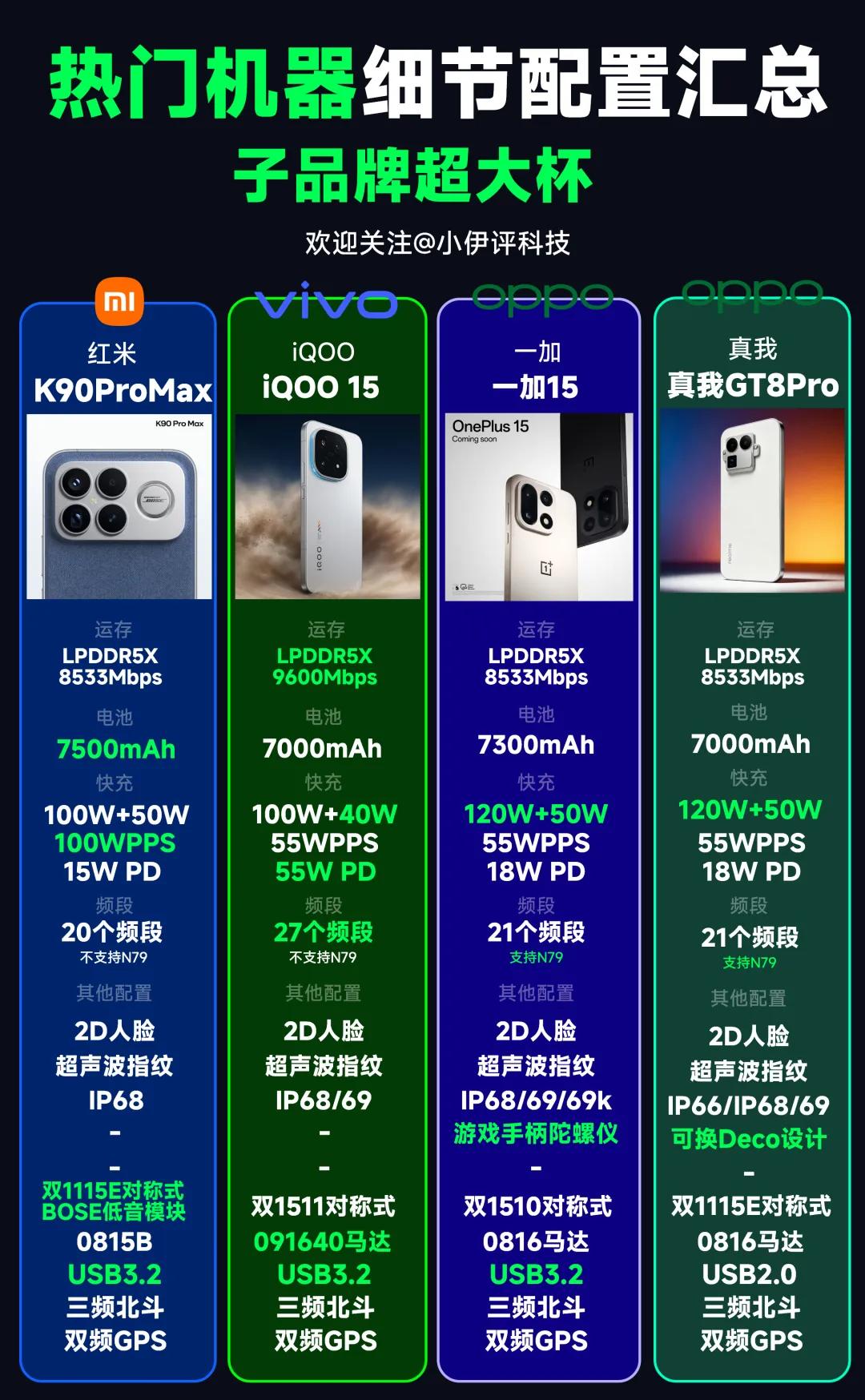 子品牌这边,大家其实都比较类似各有优势,相对做得比较好的是iQOO 15以及红米K90ProMax。