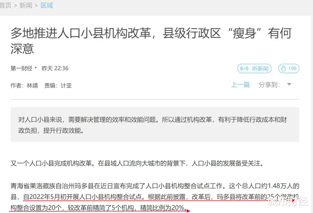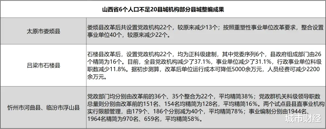 早在2020年,财政吃紧的山西省就选取了忻州市河曲县、临汾市浮山县、太原市娄烦县、吕梁市石楼县、晋中市榆社县、长治市黎城县6个人口不足20万的小县开启整编改革试点。