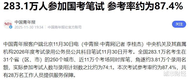 中央机关及其直属机构2026年度考试录用公务员公共科目笔试11月30日开考。全国283.1万名考生在31个省(区、市)的250个城市、近11万个考场同时挥笔,角逐约3.81万个录用名额,实际参加考试人数与录用计划数之比约为74:1。本次考试参考率约为87.4%,共有28万名工作人员提供服务保障。