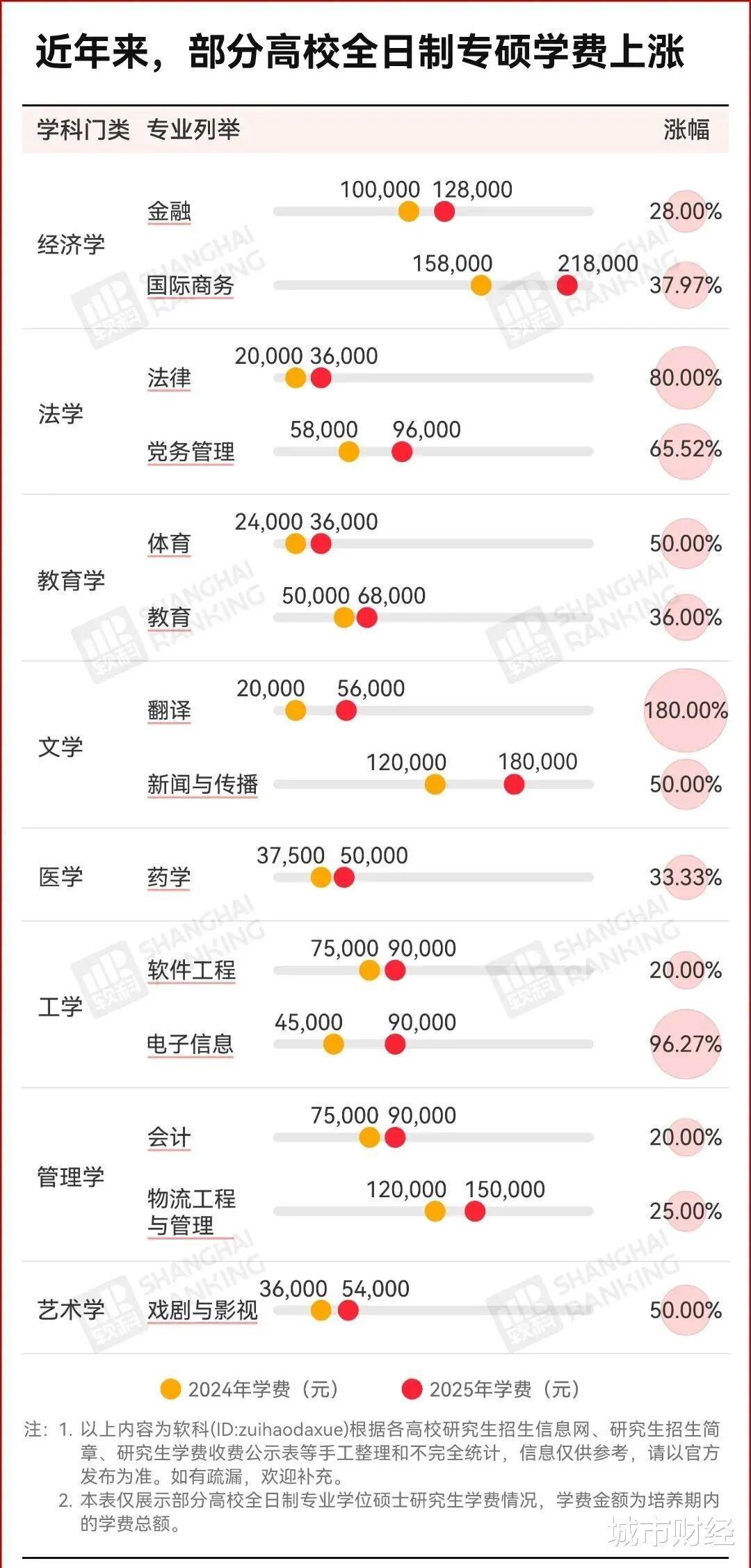 软科就报道,某C9高校金融、保险、税务、应用统计全日制专硕的学费总额,从去年的21.8万涨到25.8万,涨幅达到18%。某财经大学25级会计专硕的数据分析与财务决策方向,也从原本的6.8万元/2年,一跃提升至9.8万元/2年,涨幅高达44%。