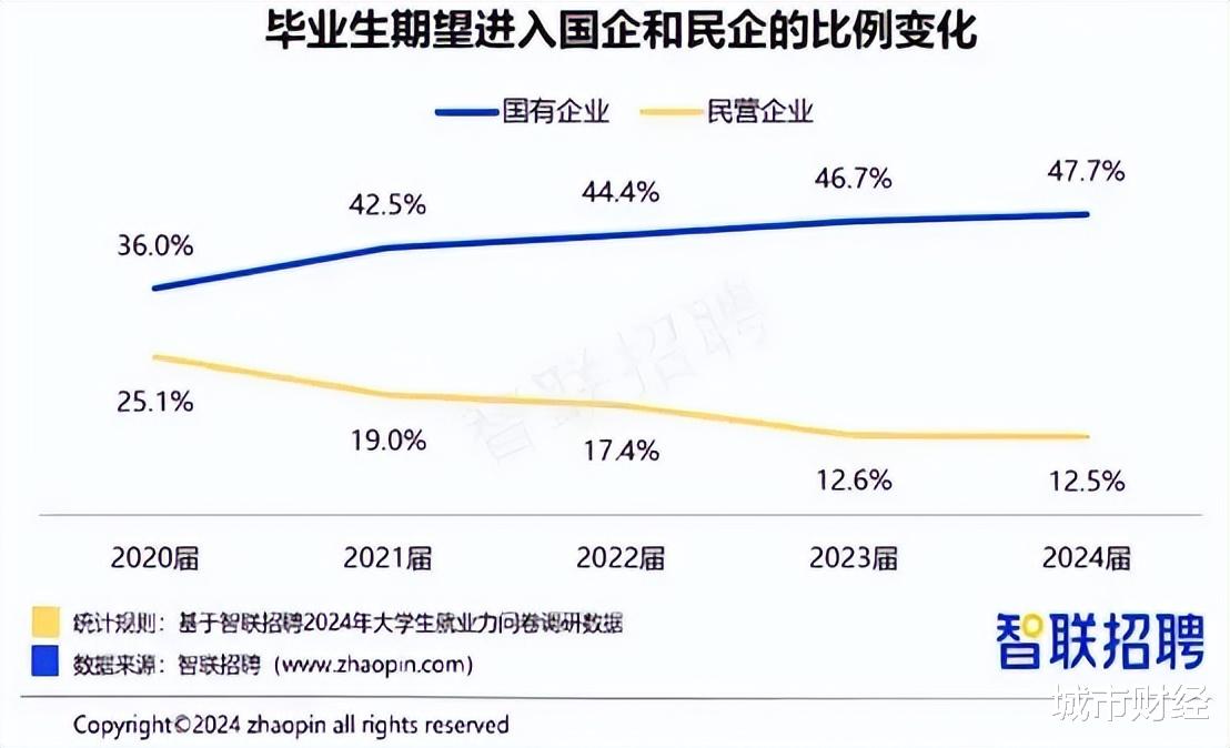 “体制外”民企对毕业生的吸引力则持续下降,期望进入的毕业生从2020年的25.1%跌至2024年的12.5%。