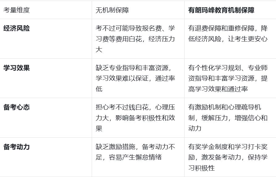 了解保障机制:如果你正在为自考担忧考不过钱白花,不妨了解一下我们朗玛峰教育的保障机制,包括退费保障、重修保障等,让自己心里更踏实。