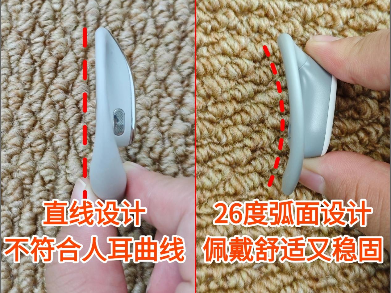 佩戴舒适感:华为 FreeArc 单耳重量只有 8.9g,佩戴时轻盈无负担,它在佩戴设计上很用心,采用 S 形贴耳曲线和 140° 三角稳固结构,还搭配亲肤的液态硅胶材质,既能贴耳舒适,又戴得稳固,长时间用也不会觉得不舒服。