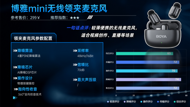品牌优势:博雅作为专业音频设备品牌,主打高性价比与迷你便携设计,旗下mini系列是首款第四代无线麦克风,聚焦隐形佩戴与基础专业收音,适配各类轻量创作人群,售价亲民。