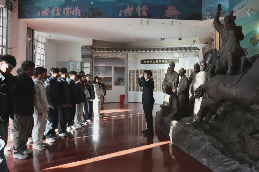 仪式结束后,学院师生在讲解员的引导下,参观了博物馆常设展览及“根亲族谱书画展”。马克思主义学院青年教师朱良晨以展厅为课堂,以馆内历史文物、雕塑为教具,开展了一场别开生面的现场教学。他围绕根亲文化与民族认同主题,生动讲述了1300多年前固始先民南迁、繁衍发展的历史,阐释了固始作为闽台同胞和海外侨胞祖地的深厚渊源,引导学生深刻理解中华文化的连续性与中华民族共同体意识。“以前觉得思政理论很抽象,现在通过触摸文物、聆听历史,真切感受到了民族文化的厚重和家国情怀的力量。” 参与活动的学生纷纷表示,这种沉浸式、行走式的教学模式,让深刻的思想变得生动鲜活,进一步深化了对铸牢中华民族共同体意识的认识。