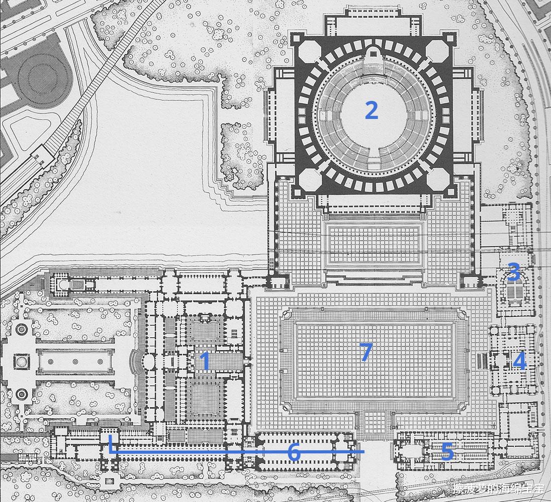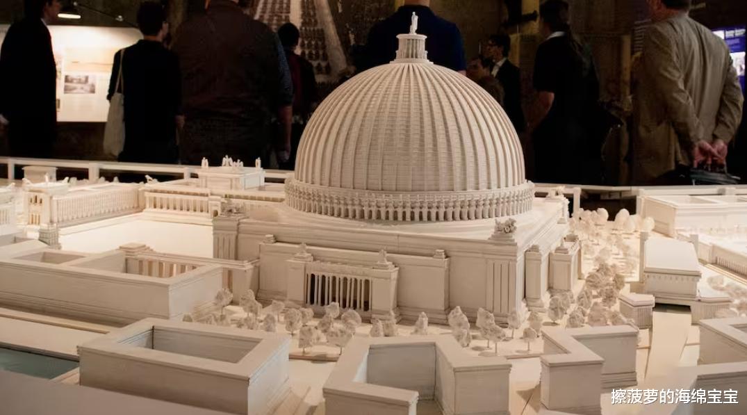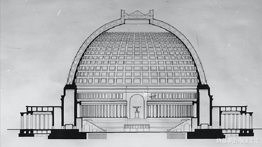 人民会堂人民会堂(Volkshalle)是位于南北轴线最北面的建筑物,又被称为“大会堂”和“荣耀会堂”。这是一座宏伟的圆顶建筑,尺寸之大,以至于柏林其他所有建筑,包括南北中轴线上的建筑都相形见绌。