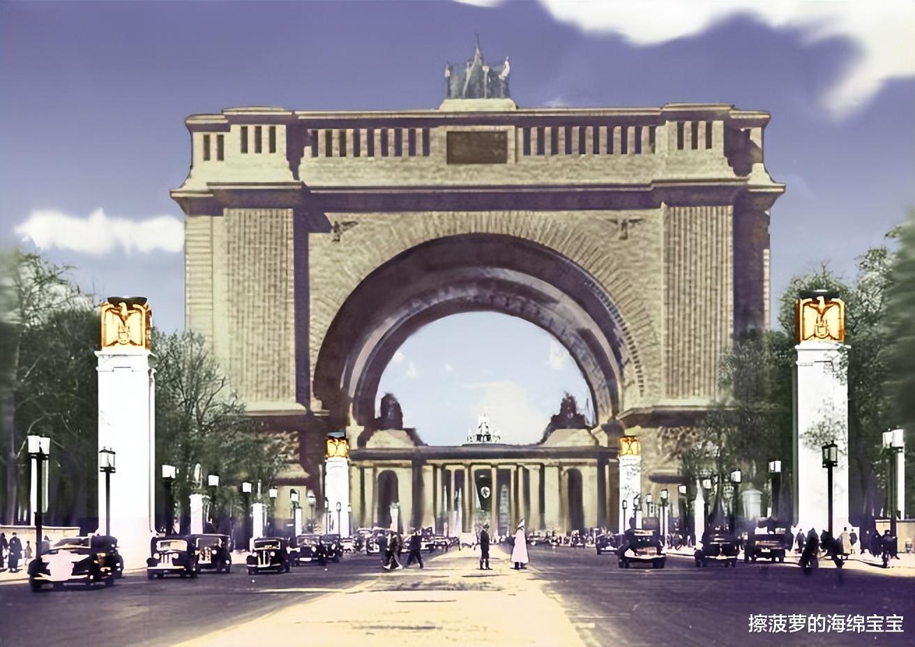 南北轴线宽度为120米,中心将建设一个巨大的凯旋门。下图是1939年的规划模型,下面是南火车站,通过南北轴线穿过凯旋门到达人民会堂。
