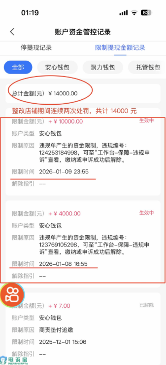 1月27日,河南省的岳先生向“电诉宝”投诉称,其作为快手平台商家,在1月8日16时54分因“推广违规品”被平台处罚4000元违约金。岳先生已认识到问题并进行申诉和整改,两次申诉均失败,正处于协商处理阶段。但在1月9日23时53分,平台再次以同类违规为由,对其追加罚款10000元。岳先生认为,平台未给予合理整改时间(后台应能查到其已在整改下架商品),且在第一次违规处理(申诉、协商)未完成的情况下连续罚款,加重了处罚。岳先生表示第一次罚款是因不熟悉规则,愿意承担;但认为第二次罚款属于误判或不合理,诉求是免除第二次10000元罚款。
