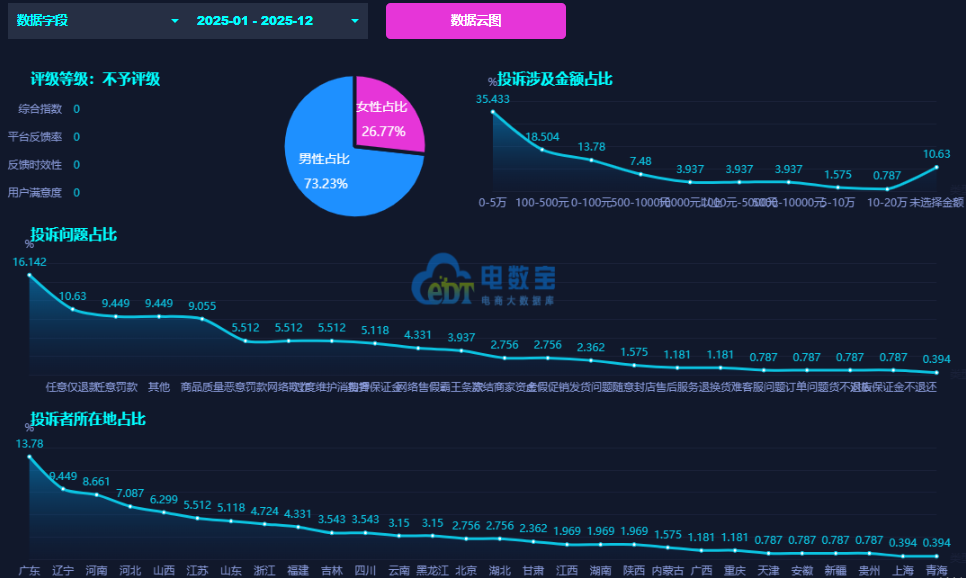 据网经社旗下电商大数据库“电数宝”监测数据显示,快手电商2025年全年投诉的问题主要包括任意仅退款、退款问题、任意罚款、商品质量、网络欺诈、网络售假、霸王条款、售后服务等。