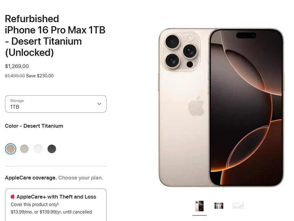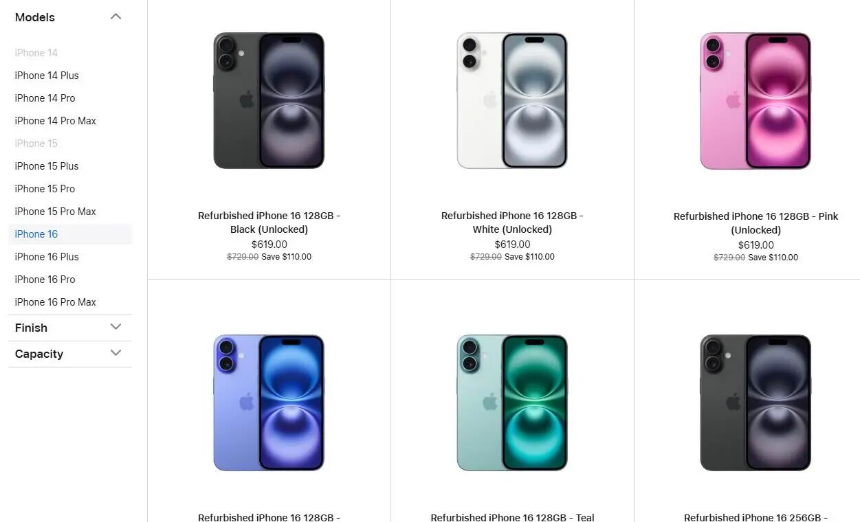 从北美官网信息来看,iPhone 16系列官翻机的定价介于619美元(128GB标准版)至1269美元(1TB Pro Max版)之间,相比首发价优惠约100–230美元。尽管被称为“翻新”,其价格并未出现大幅下降,显示出苹果意在维持品牌价值,避免对新机销售造成冲击。