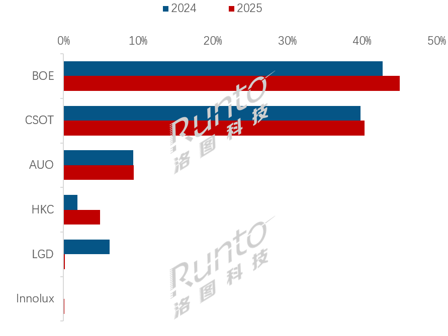 归属于商用显示范畴的大尺寸交互平板面板更是几乎全由中国厂商供应。根据洛图科技(RUNTO)数据显示,2025年全年,中国大陆三大面板厂商(BOE、CSOT、HKC)在全球出货量中的合并市占率首次突破9成,为90.3%,同比2024年提升了5.9个百分点。
