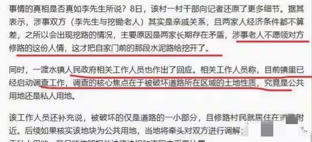 真相是,这老太太和修路牵头人老李有过纠纷,两人是远房亲戚,早些年因为宅基地边界和养老问题闹僵了。