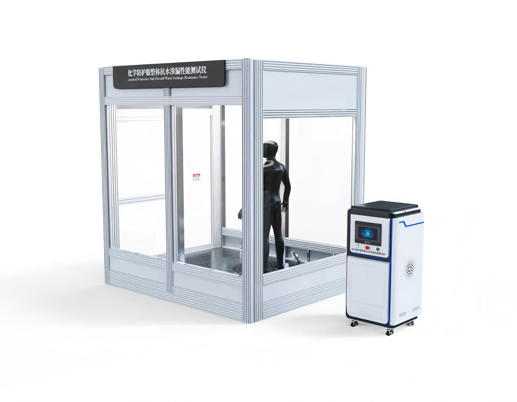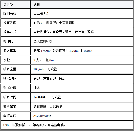 本仪器从不同角度用水枪冲刷化学防护服装,测定服装内部渗漏情况。