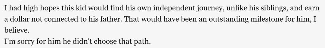 “我曾满怀希望,这个孩子能找到属于自己的独立之路,不像他的兄弟姐妹那样全力倚父。独立对他来说会是一个了不起的里程碑。