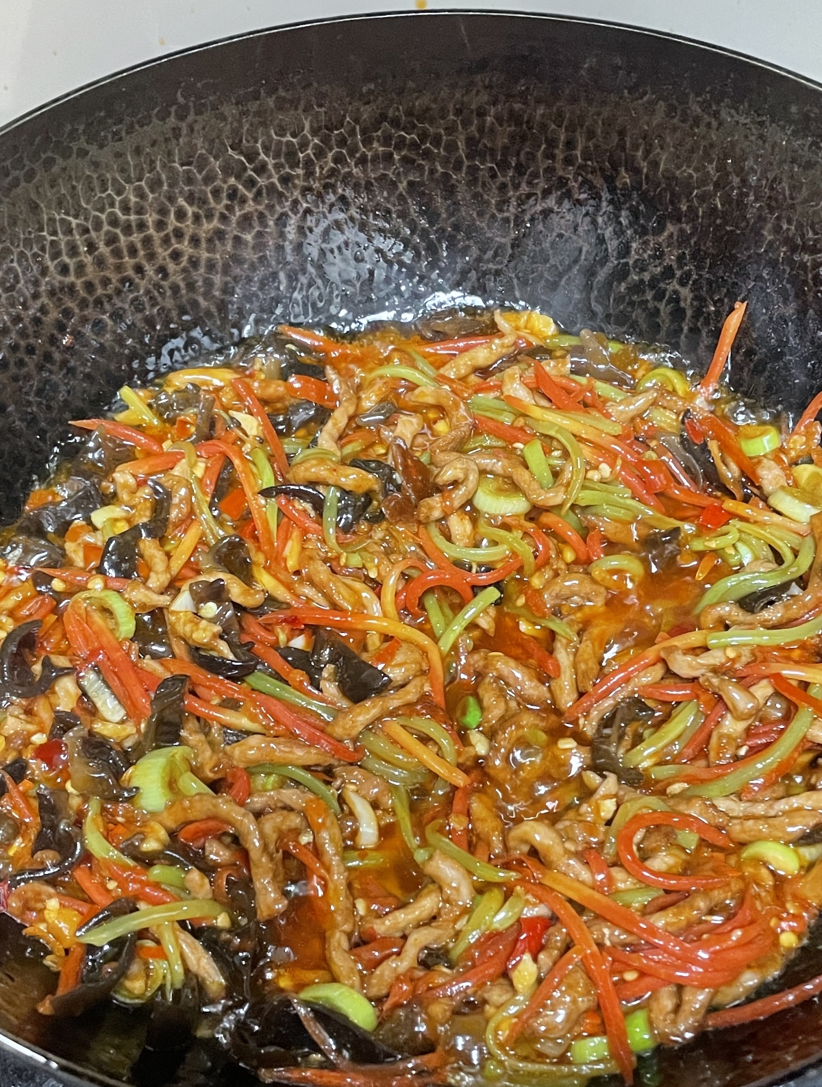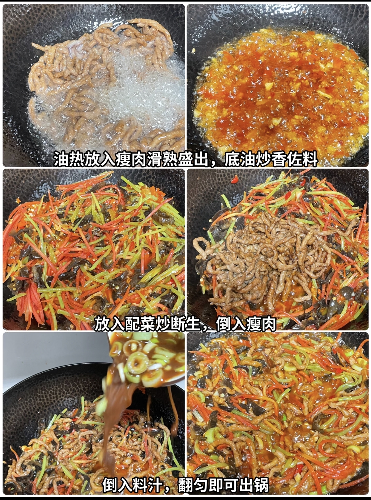 此时,将滑好的肉丝倒回锅中,与配菜混合均匀。关键的一步来了,把之前调好的碗汁再次搅拌一下(防止淀粉沉淀),然后淋入锅中。大火快速翻炒,看着汤汁逐渐变得浓稠,紧紧地包裹在每一根肉丝和配菜上,油亮诱人。最后撒上一把翠绿的葱花,颠勺出锅。
