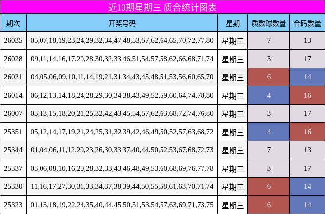 从近10期星期三的质合数据来看,合数号码累计开出151个,质数仅49个,合数明显占据主导地位。上期开出7个质数、13个合数,质数走势仍处低位。值得注意的是,近10期中质合比为5:15的情况未出现,而6:14和7:13各出现2次,说明质数在中等偏高区间仍有波动空间。本期预测质数开出5个,合数15个,与上期相比质数略有回升,合数维持高位,整体呈现‘合数主导、质数修复’的格局。