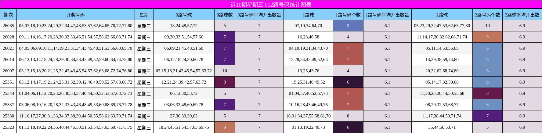 012路分布:0路与1路双热,2路稳中有升近10期星期三数据显示,0路号码平均每期开出7.0个,1路6.1个,2路6.9个,0路与2路略高于1路,但整体差距不大。然而,本期明确指出‘0路号码会热出’,并预测012路比为4:10:6,即1路号码将大幅热出,预计开出10个,远高于历史均值。这一判断与上期1路仅开出5个形成对比,说明1路或进入补涨阶段。