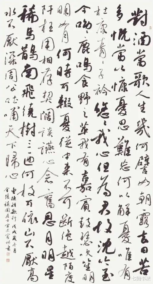他研习孙过庭的草法,领悟“草以点画为情性,使转为形质”的真谛,让草书线条兼具弹性与力量;他借鉴颜真卿的风骨,将楷书的端庄厚重融入行草之中,使作品既有飘逸之姿,又有沉雄之气;他品读苏轼的意趣,在笔墨间融入文人的雅致与洒脱,让作品超越了单纯的技法展示,成为情感与文化的载体。