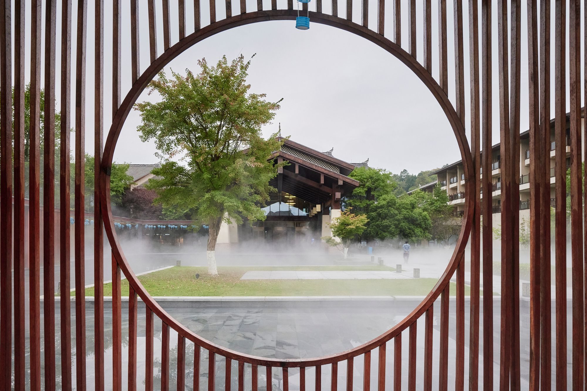 每一处造景都暗藏着设计者的巧思,木质圆窗框框出完美的中式风景画,画中云雾缭绕,亭台楼阁掩映着绿树,如在仙境,