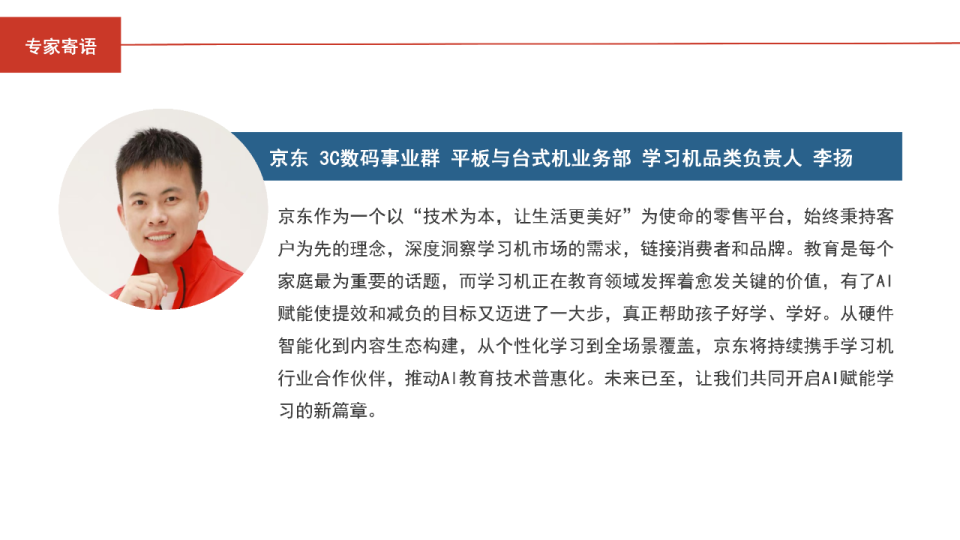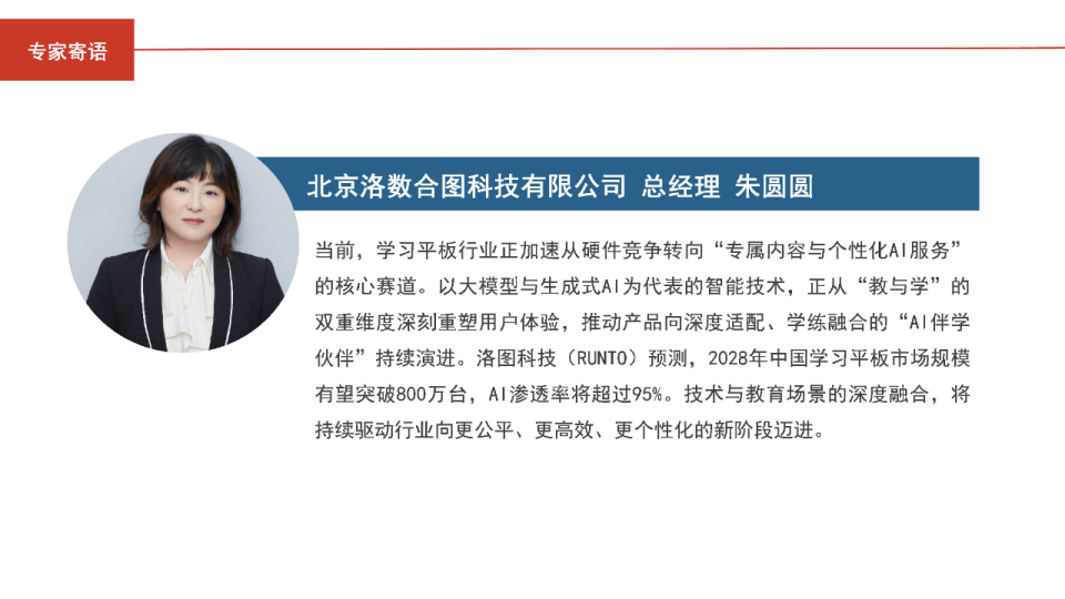 作为覆盖行业监管、渠道平台、权威数据、核心企业的全链条共识成果,该白皮书不仅系统解读了学习平板的行业背景与市场现状,更聚焦AI技术驱动下产品的演进逻辑,通过典型品牌案例剖析呈现产业竞争格局,并对未来技术突破、场景拓展、消费升级等趋势作出前瞻性展望。