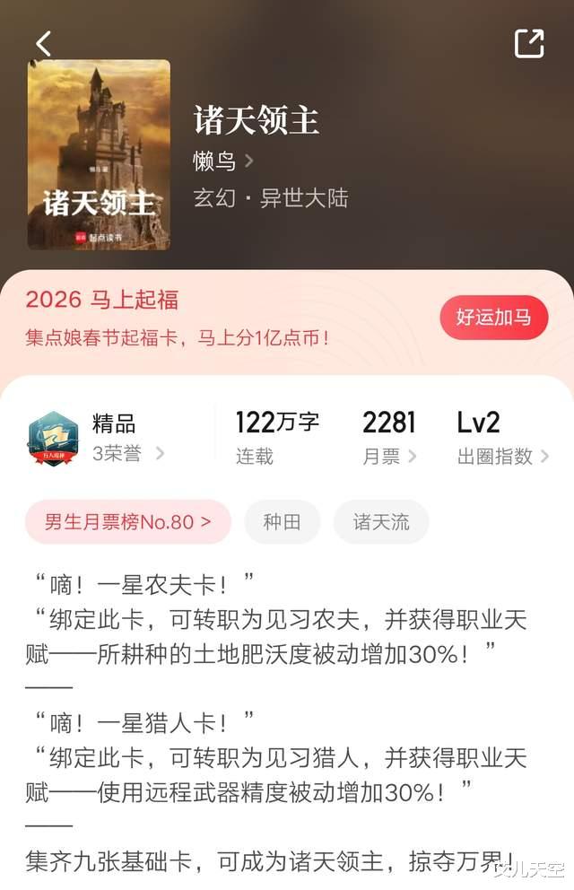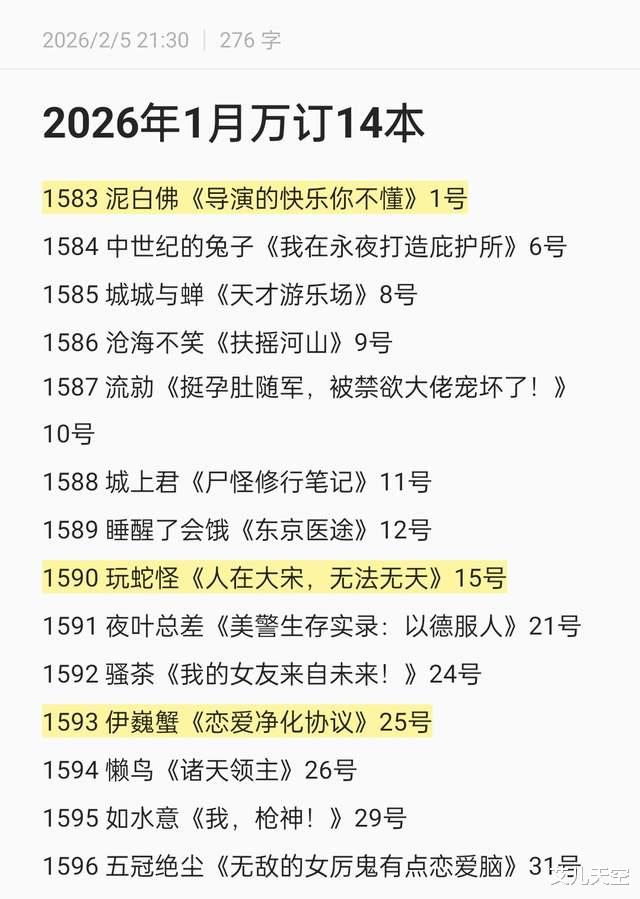 一月份起点新增万订14本,比2025年1月的15本少了一本,整体差别不大,其中有三本是完结后万订,剩余的还在连载中,那么具体来看看都是哪些作品。