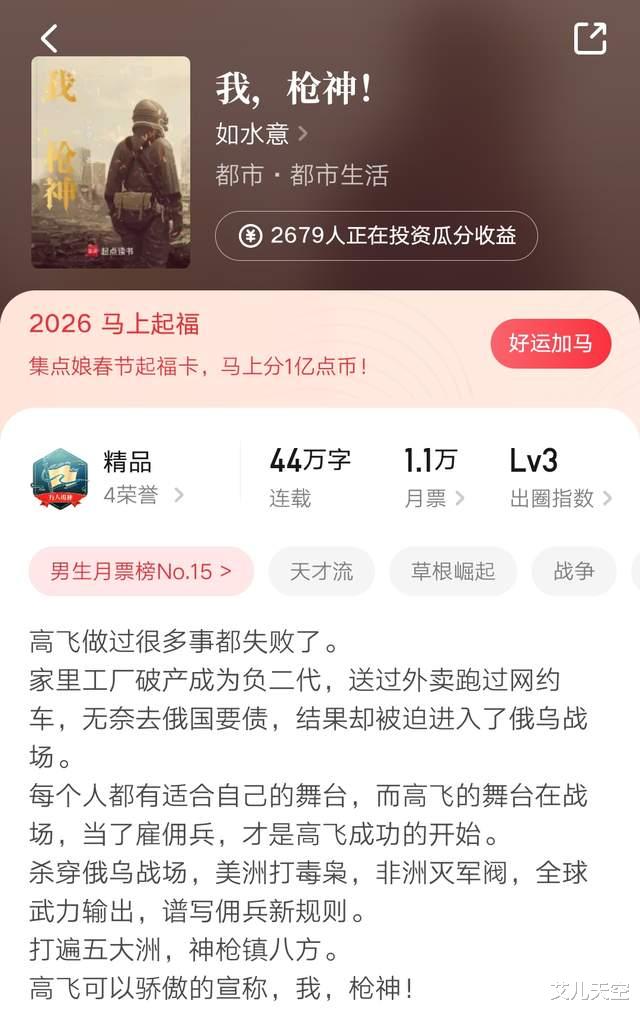 大神如水意的第五本万订,主角从意外成为瓦格纳雇佣兵开局。上架首订一万四,有俄乌战场的活,喜欢看雇佣兵题材的,可以试试如水意的小说。