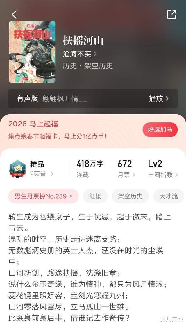 沧海不笑作品,原名是《红楼之扶摇河山》,红楼梦同人,省博研究员穿越成贾赦庶子十岁的贾琮。