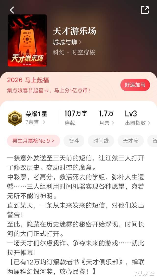 城城与蝉作品,《天才俱乐部》之后的又一本天才系列作品。目前作品表现不如上本,新书开局也陷入过是否过度借鉴了《命运石之门》的争议。