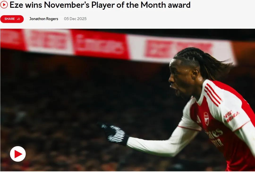 此外,埃泽在北伦敦德比中的第三个进球被评为了阿森纳11月最佳进球,这也是他连续两个月拿下队内最佳进球奖!