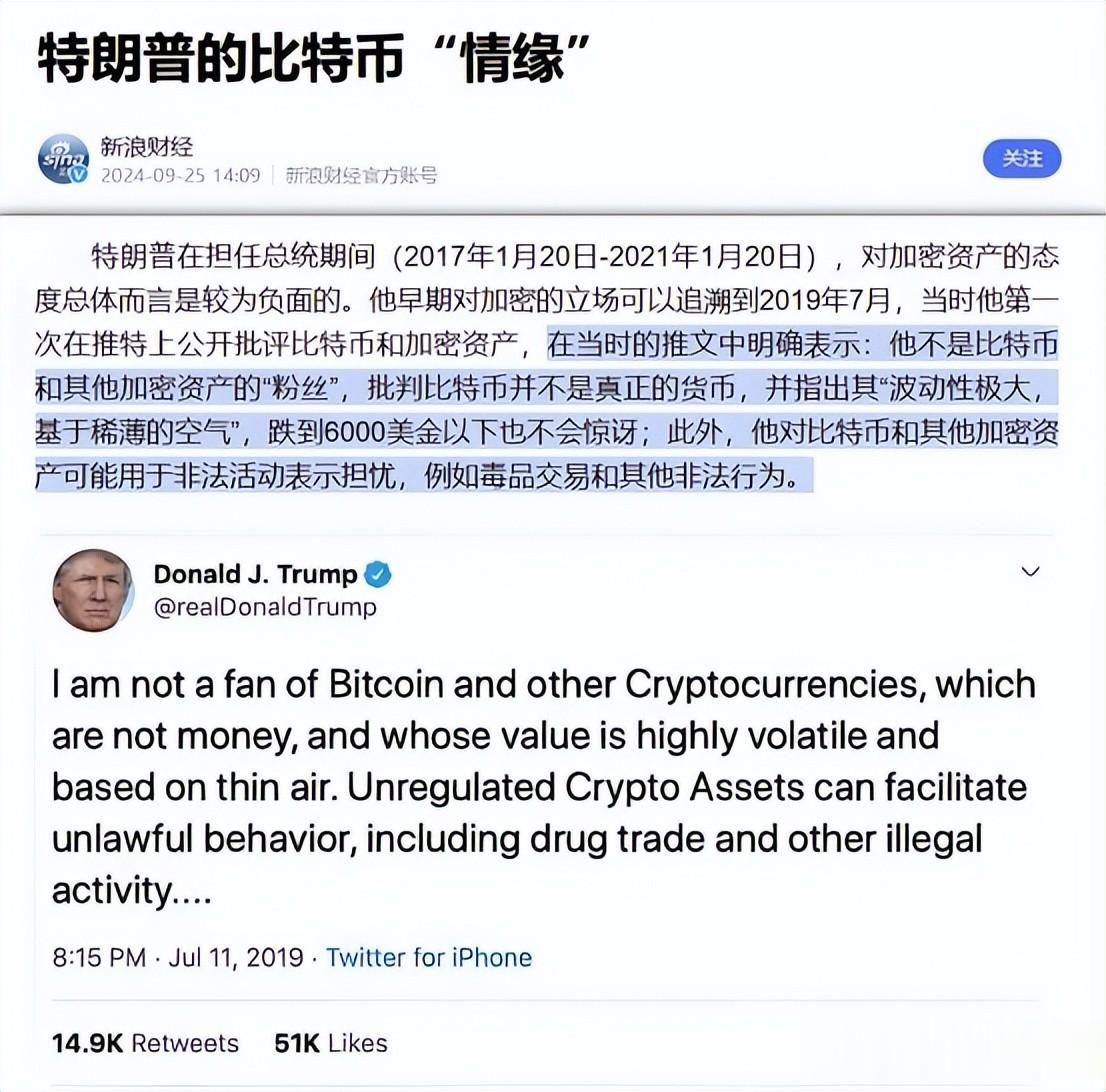 2019年,特朗普第一任期的最后一年,他在互联网平台上针对于加密货币发表过非常极端的言论,他批判比特币并不是真正的货币,并指出其“波动性极大,基于稀薄的空气。”