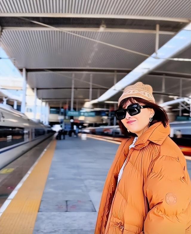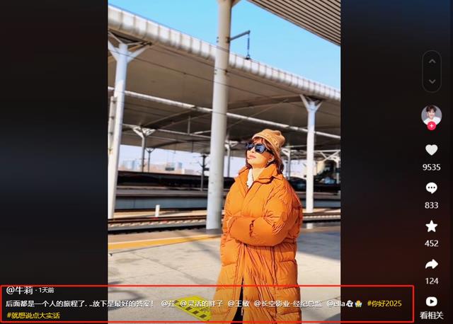 在视频中,我们可以清楚地看到,穿着一件藤黄色羽绒衣,戴着毛线圈和大墨镜的牛莉,独自出现在了某车站,略显萧瑟。